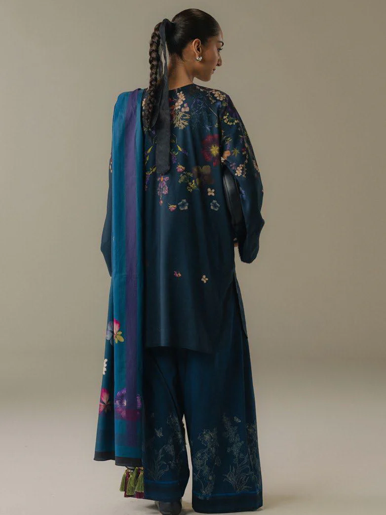 An atlantic deep shirt inspired by lush botanical elements, paired with matching trousers adorned with delicate floral patterns. The look is completed with an atlantic deep shawl featuring a mix of stripes and florals, creating a refined, cohesive ensemble that beautifully blends depth and natural elegance.