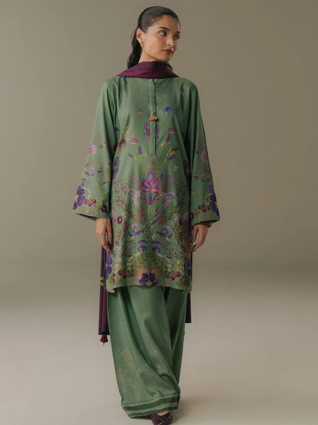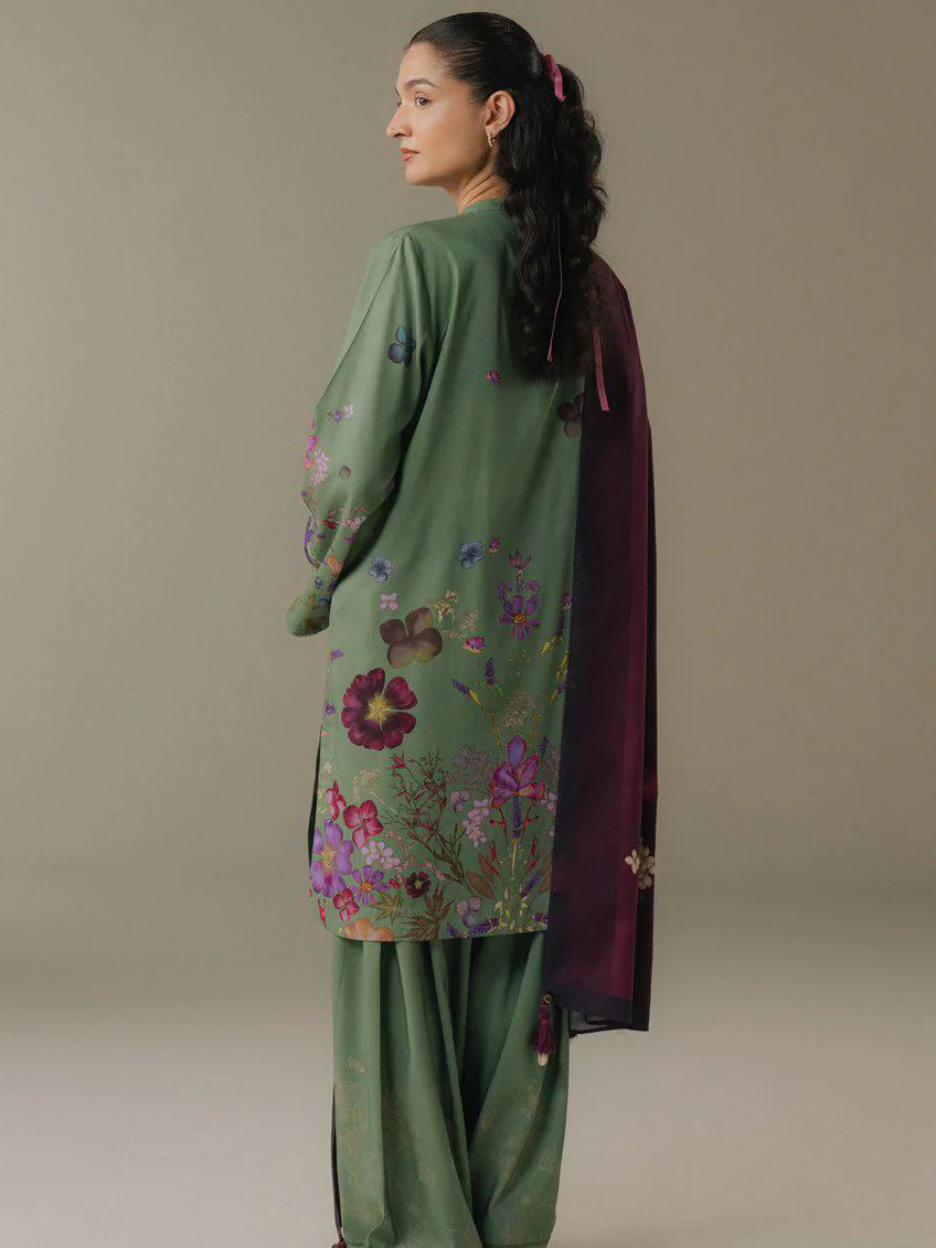 A hedge green shirt inspired by botanical motifs, paired with matching hedge green trousers featuring soft floral patterns. The ensemble is elevated with a deep purple shawl adorned with a blend of stripes and florals, adding a striking contrast and a touch of artistic sophistication to the look.