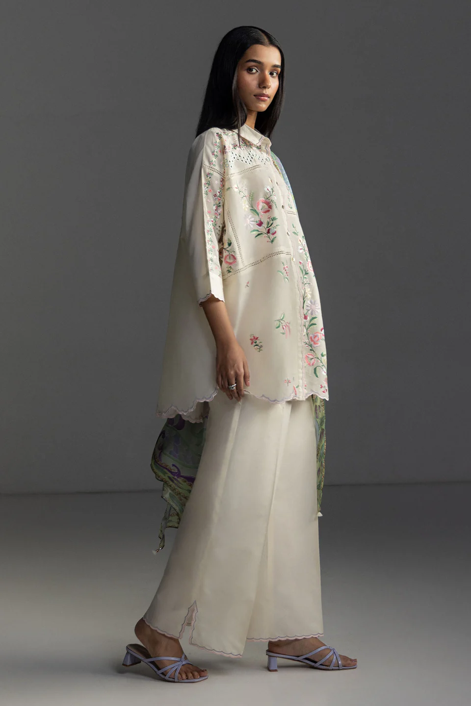An offwhite shirt adorned with floral and schiffli embroidery, paired with a dyed offwhite trouser, and finished with a printed multicolor dupatta for a light, airy elegance.