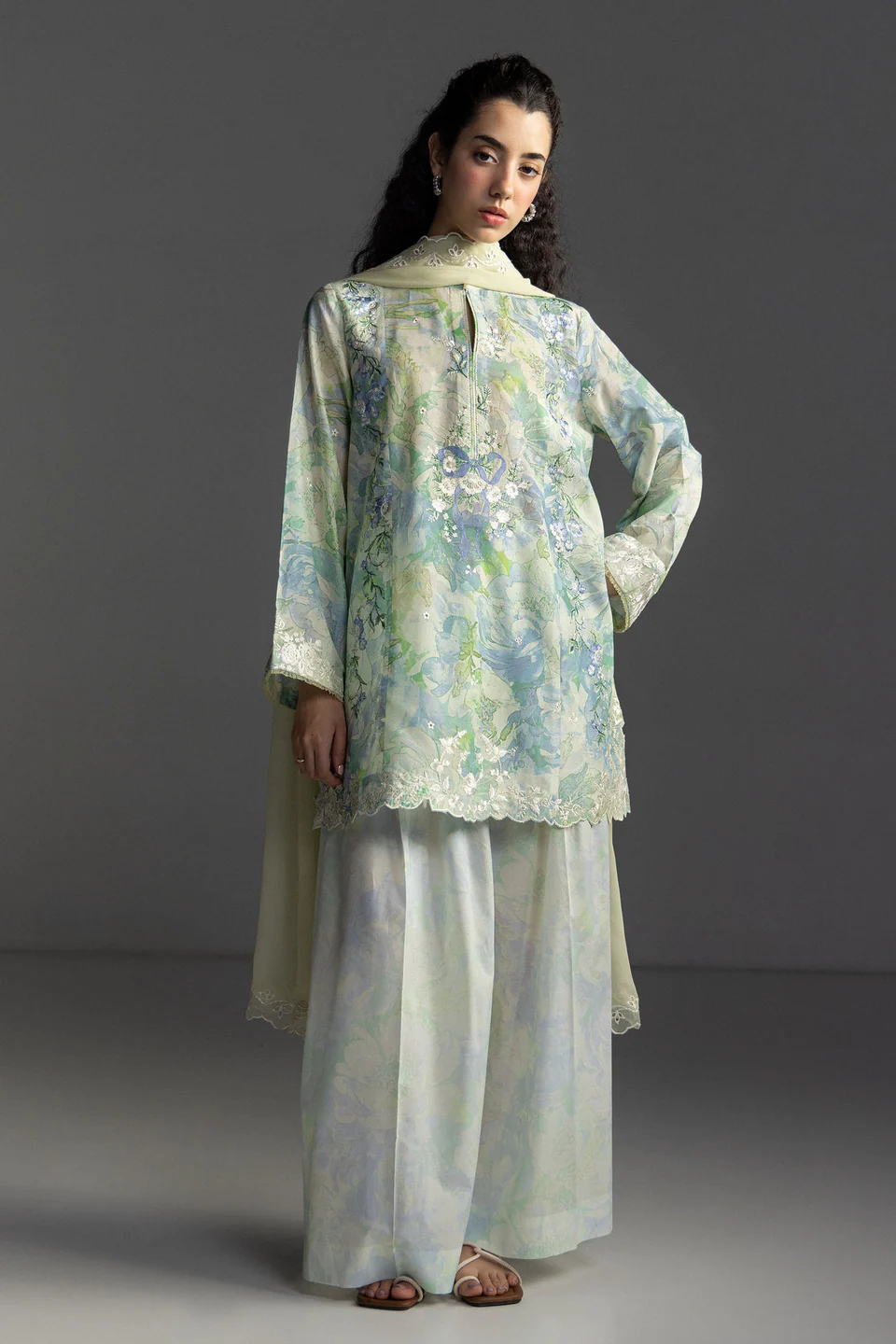 An embroidered aqua marine shirt with watercolor inspired print and schiffli embroidery, paired with a printed trouser, and finished with a sugar white dupatta for a dreamy, artistic ensemble.