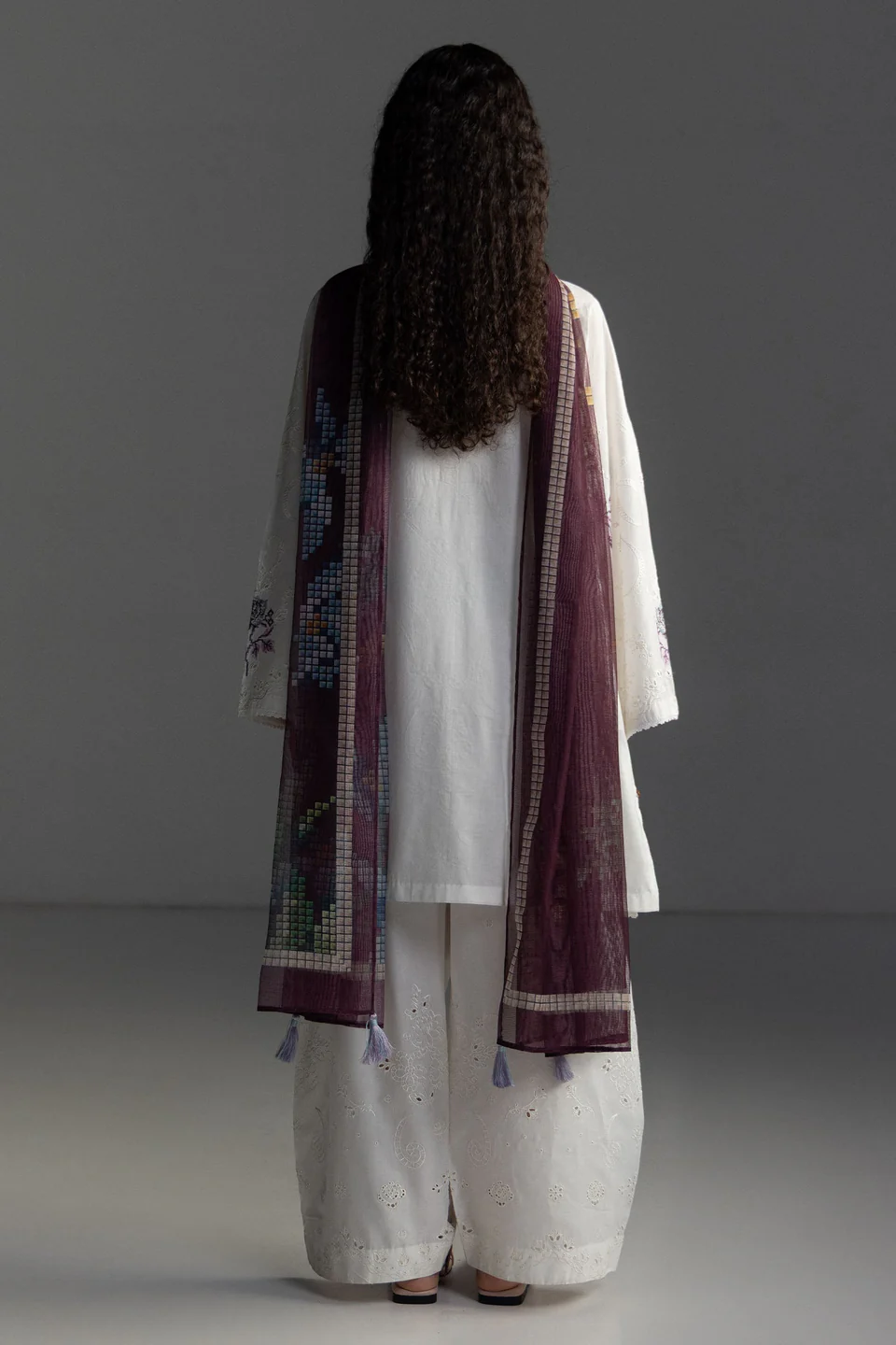 A stone white embroidered shirt with modern laces and chikankari details, paired with an embroidered trouser, and finished with a printed burnt red dupatta for a soft, elegant finish.