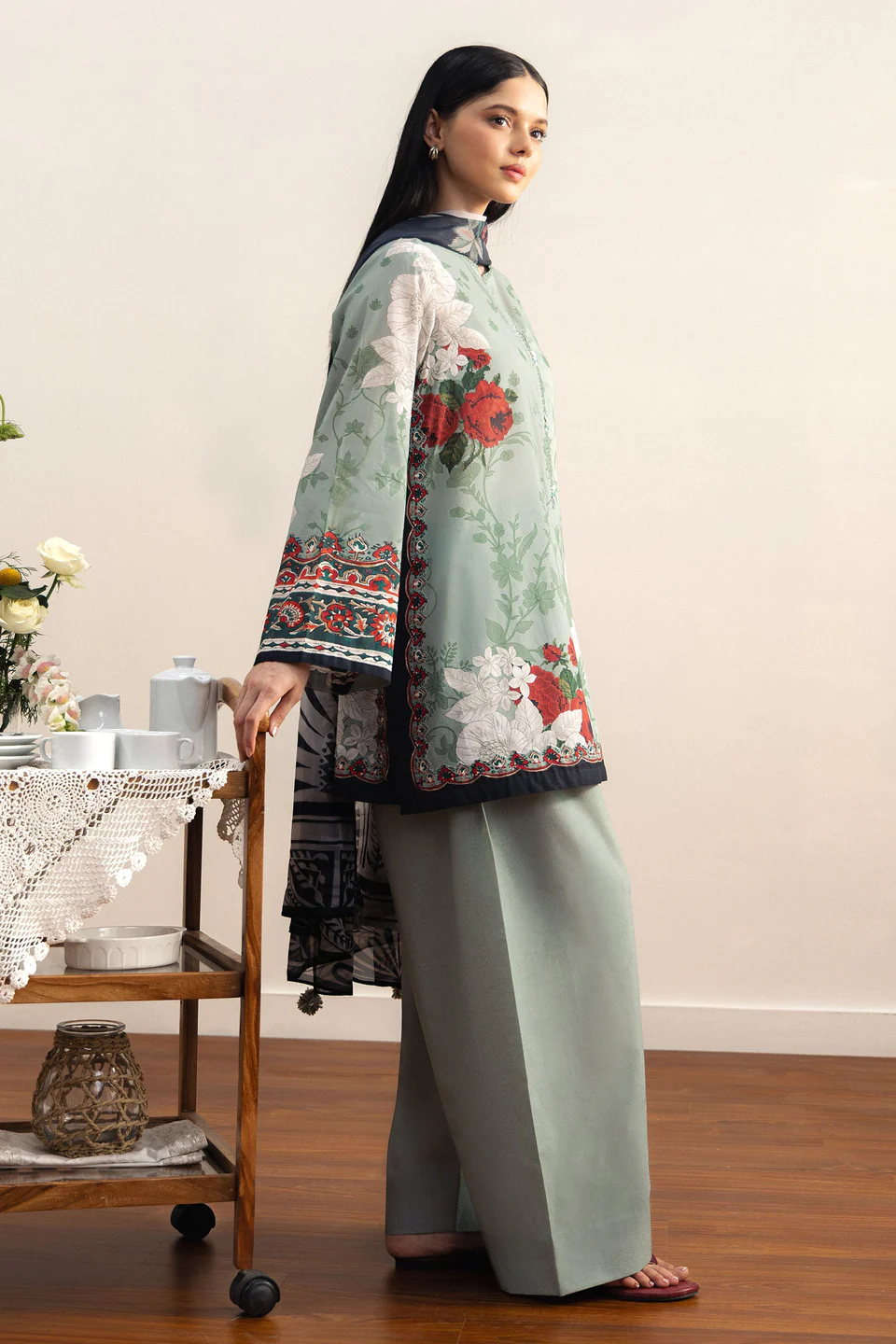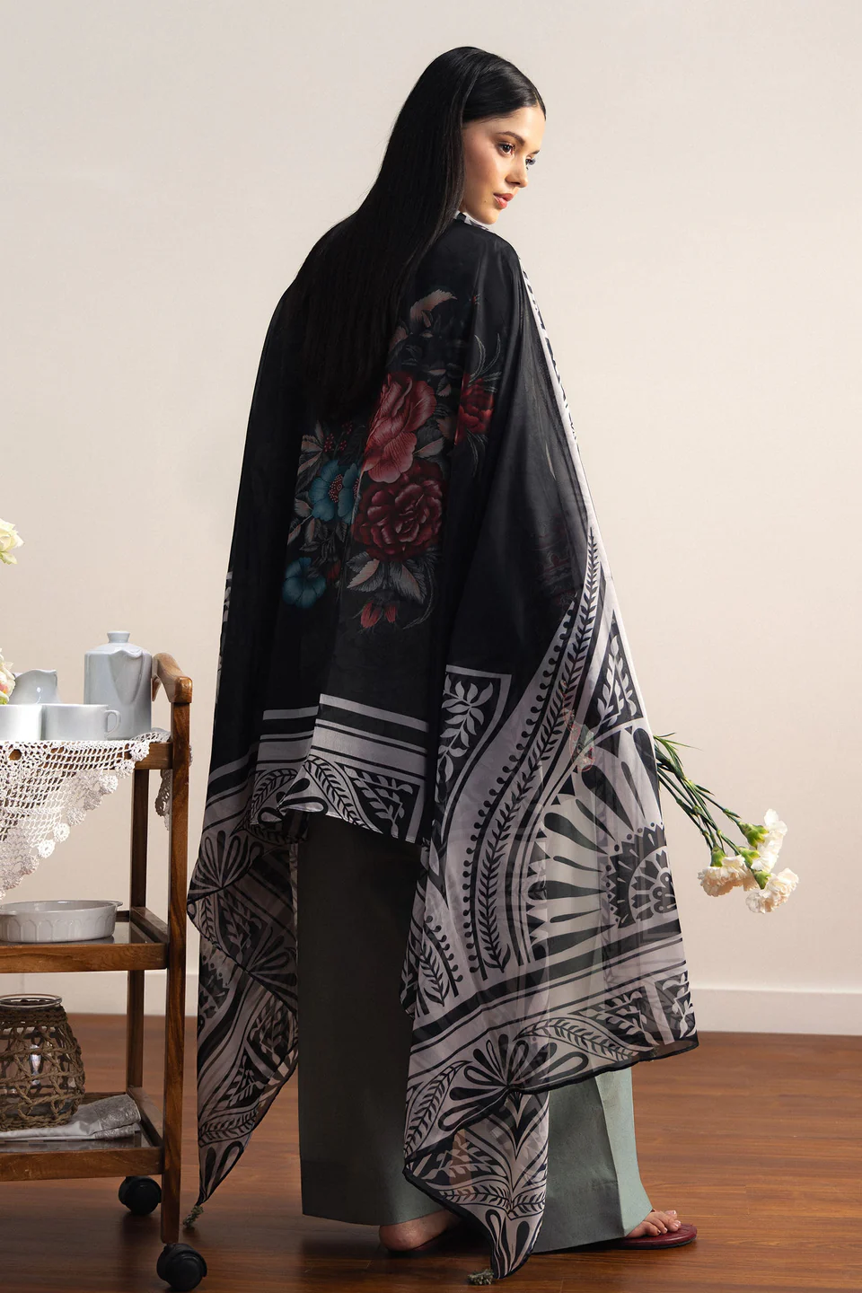 A bold interplay of black, sage, and ivory with striking floral accents. The dramatic dupatta and detailed borders create a contemporary yet sophisticated statement look.