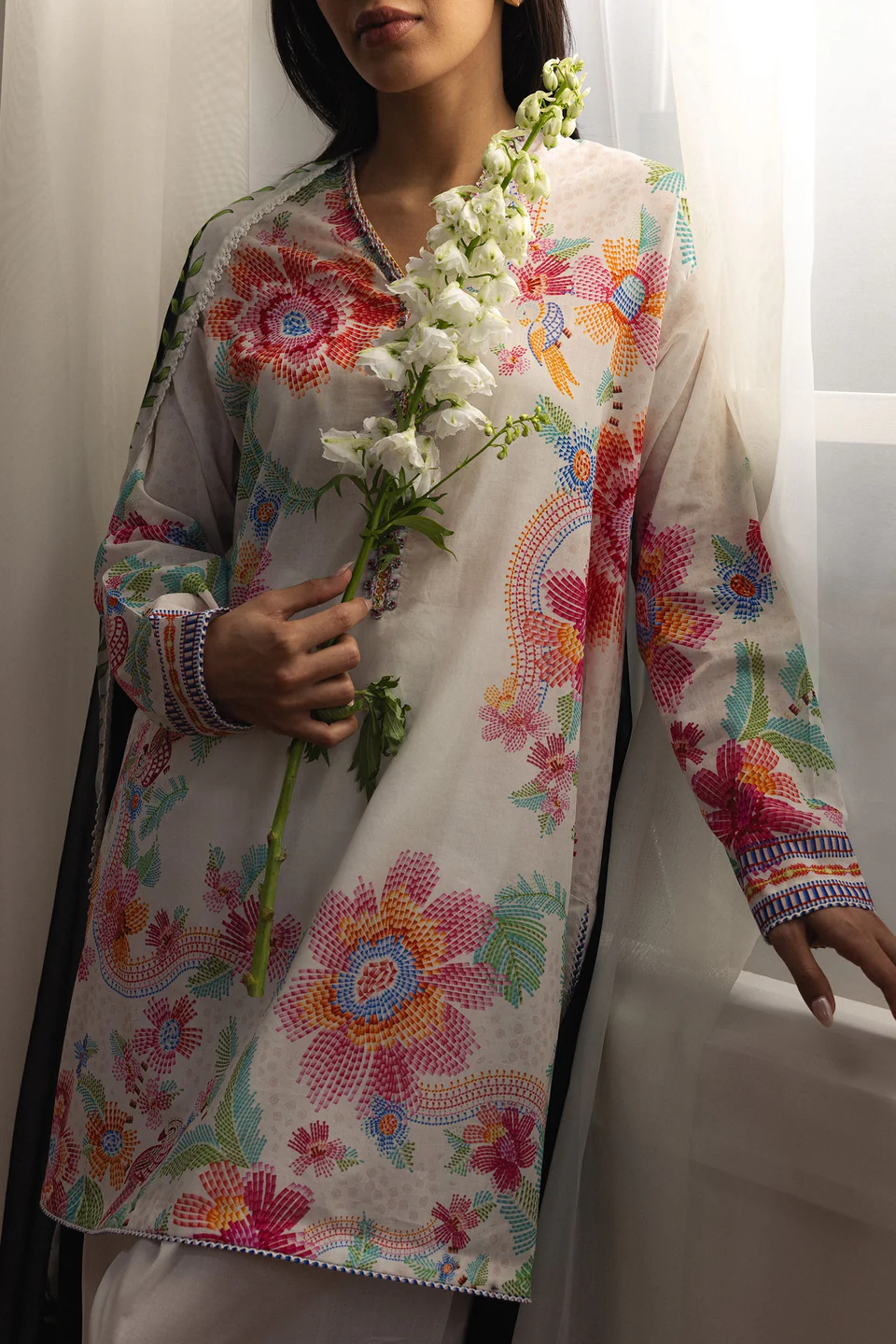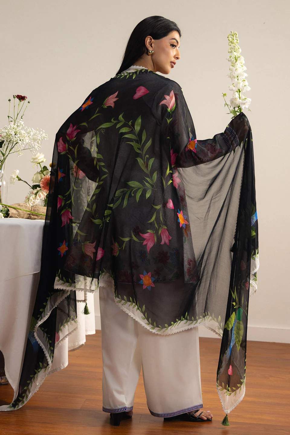 A delicate interplay of pastel florals and ornamental birds on an off-white base. Light, airy, and feminine, the look is elevated with a striking black dupatta adorned with vivid floral garlands—balancing softness with bold contrast.