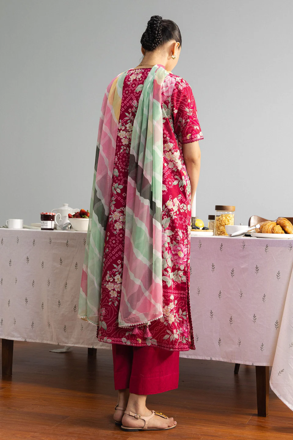 Bold and expressive, this magenta design features lush floral bouquets layered over subtle geometric textures. A vibrant striped dupatta completes the look with a contemporary, statement-making finish.