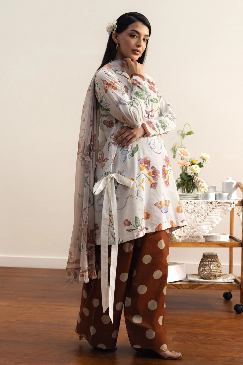 Soft ivory meets muted multi-tonal florals in a symmetrical layout. The silk dupatta’s ornate framing adds sophistication, while polka-dotted trousers introduce a subtle, playful contrast.