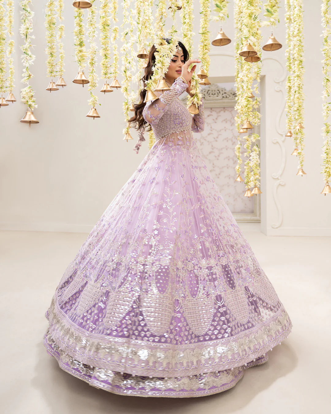Poised and polished, Pinar is a vision of quiet glamour. The soft-toned, lilac net front bodice jacket drapes elegantly, tracing delicate lines that flatter and flow with its artfully arranged embroidery patterns. The printed and embroidered Shamose silk lehnga further enhances the ensemble’s sculptural silhouette. Paired with a flowy chiffon dupatta, this piece captures the essence of festive refinement with understated elegance.