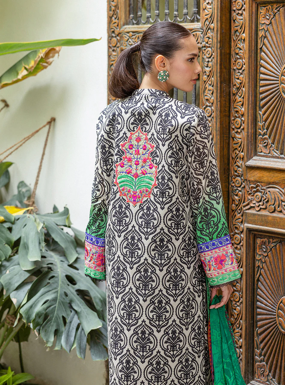 Discover the midnight garden of TIA, an unstitched masterpiece from Zainab Chottani’s latest Lawn Collection. Crafted from high-quality lawn, this design showcases a unique black print on a light, creamy background, creating a mesmerizing base. The design truly comes alive with splashes of vibrant green and hot pink on the lower shirt and sleeves.