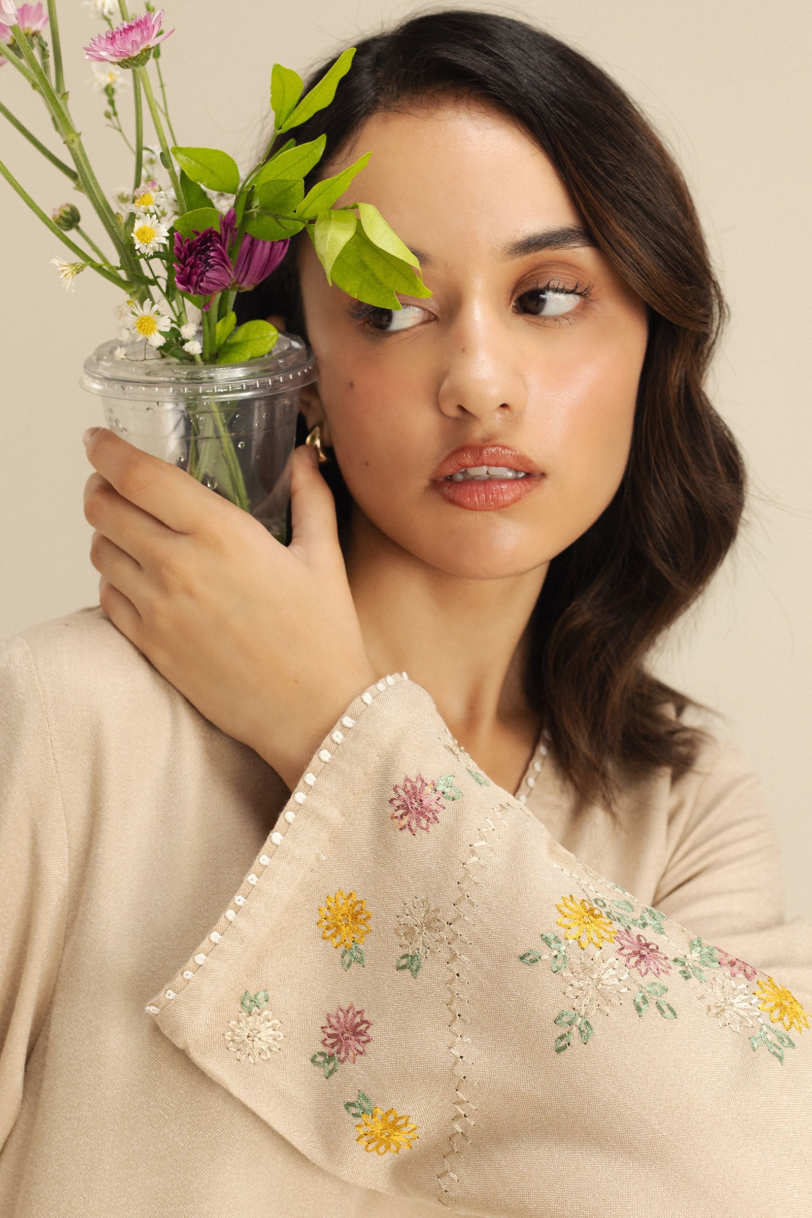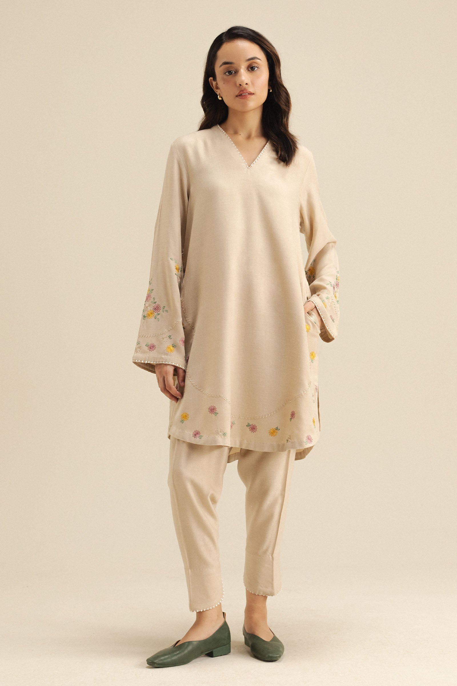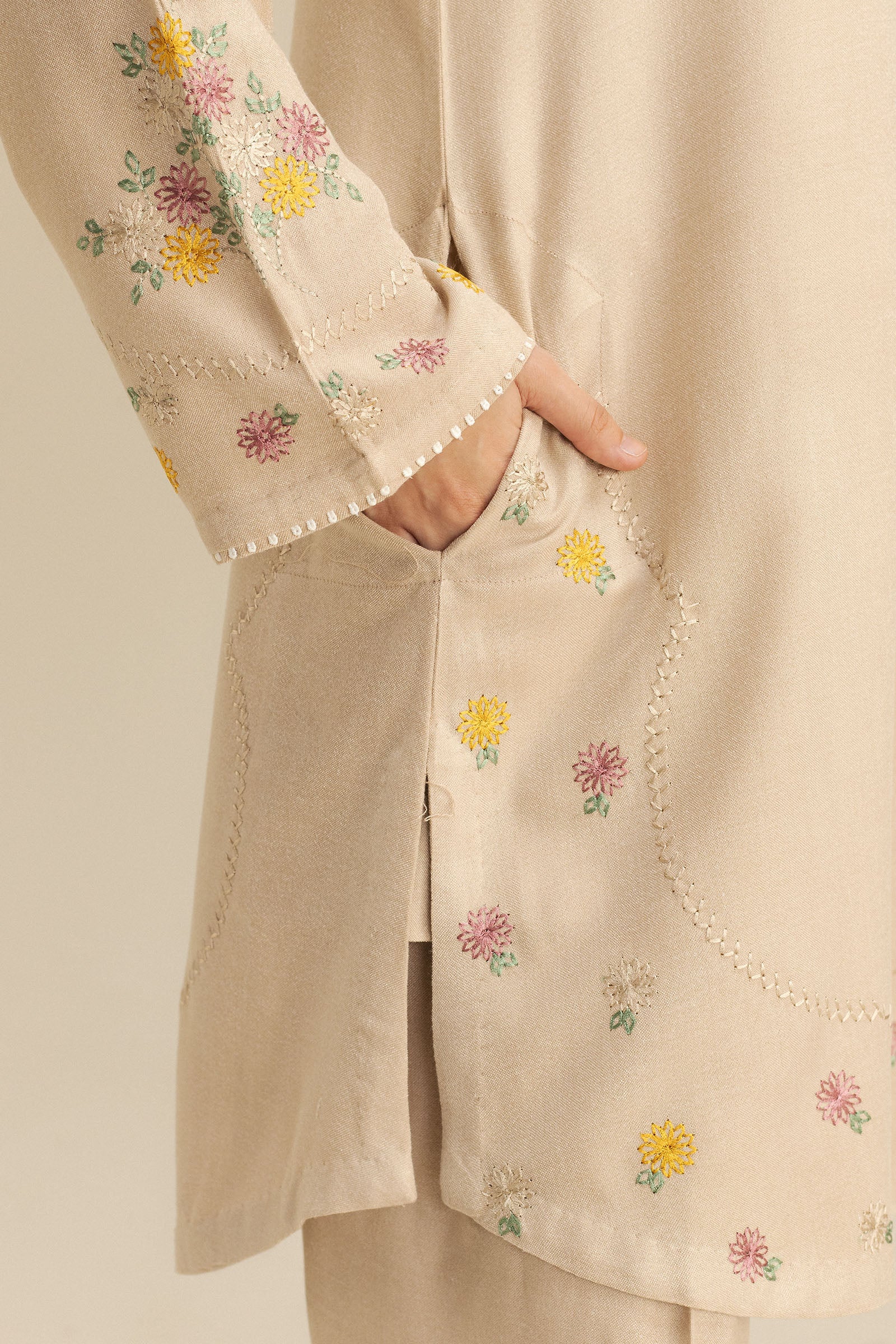 A beige wool peach outfit featuring intricate embroidery along the hem and sleeves for timeless elegance. It is paired with a matching trouser.