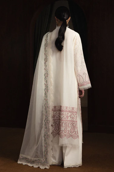 Hikari is crafted in white with Kashmiri and kashidakari-inspired embroidery, paired with a terracotta embroidered dupatta adorned with delicate Kashmiri motifs. Detailed with organza borders, embroidered panels, and matching dyed cambric trousers, the ensemble exudes heritage-rooted sophistication and understated elegance.